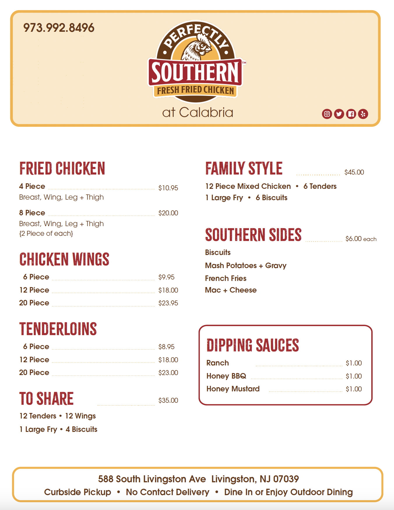 PERFECTLY SOUTHERN FRESH FRIED CHICKEN MENU